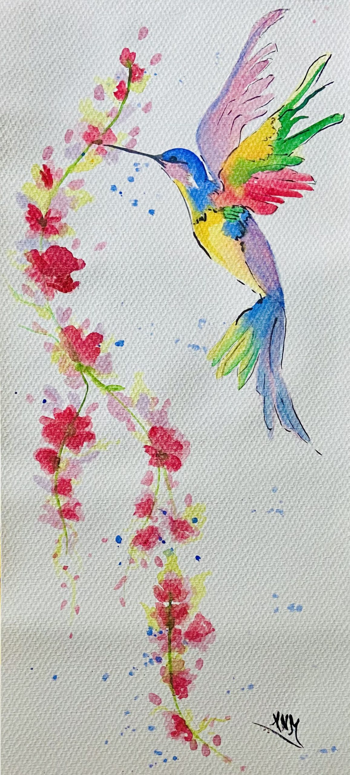 Las acuarelas de Mercedes Naranjo, con su delicada y vibrante paleta de colores, capturan la gracia y el movimiento del colibrí, invitando a reflexionar sobre la importancia de la conexión, el crecimiento y la transformación personal y colectiva.